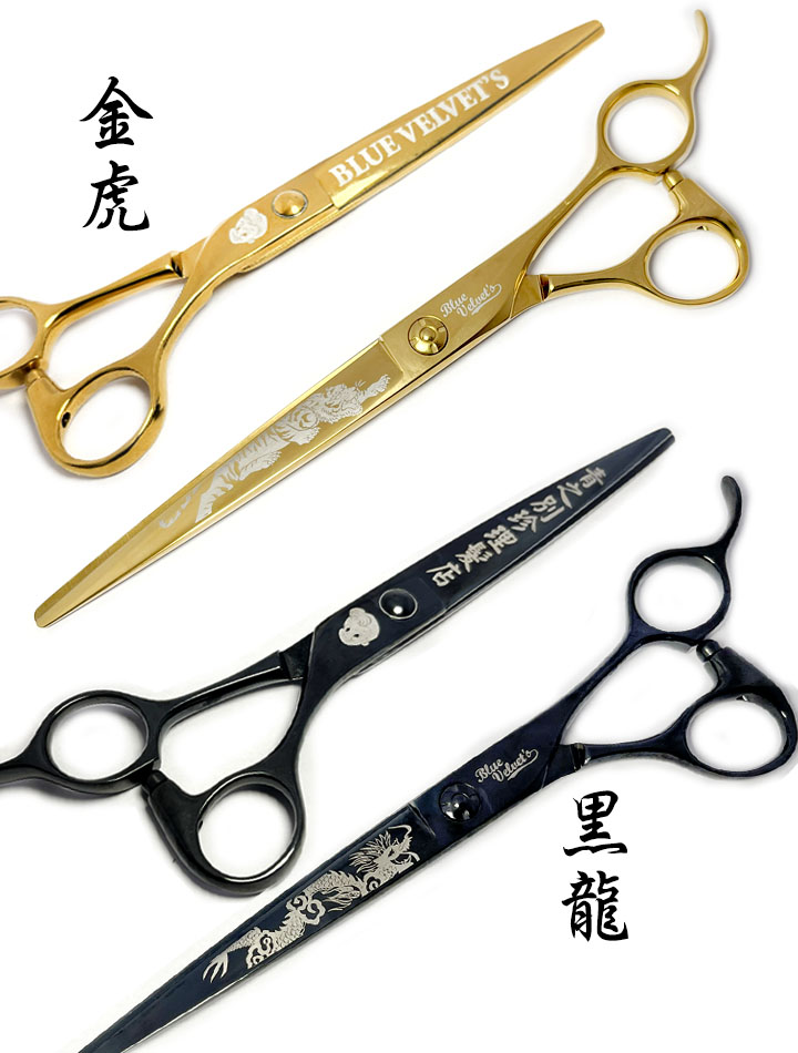 ■品名:シザーズ/金虎・黒龍 ■サイズ:7インチ(サイレント用スペアゴム付き) ■価格:¥121,000 ※黒龍:V10コバルト、ブラックチタンコーティングに龍の彫金 ※金虎:V10コバルト、ゴールドチタンコーティングに虎の彫金